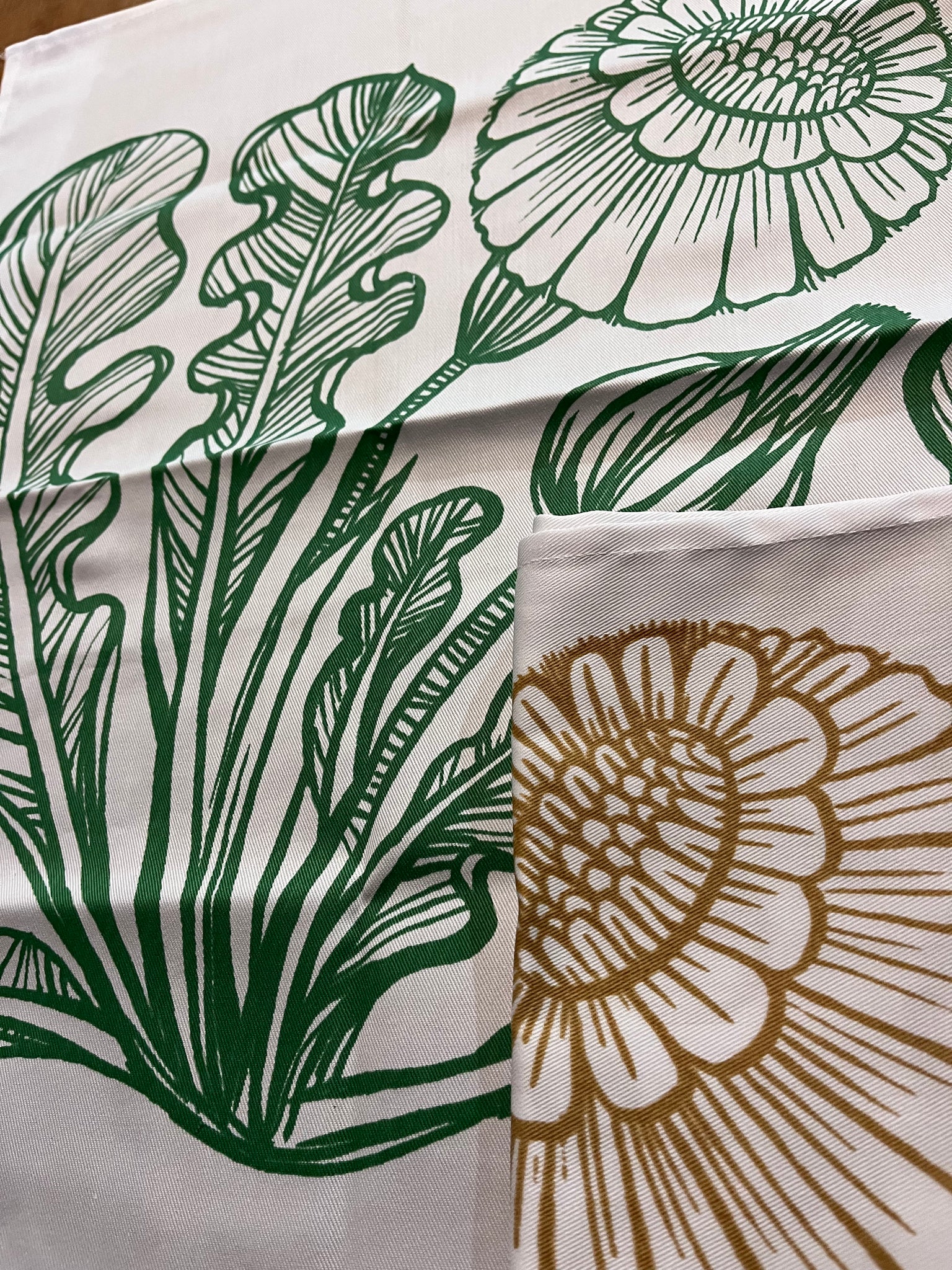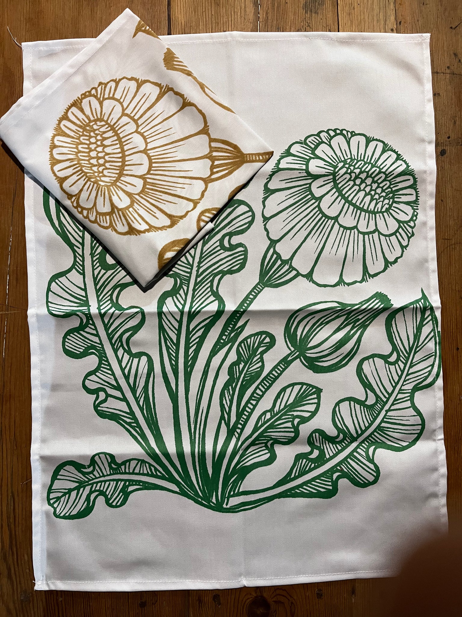 Poppy Tea Towels Set. Green and Tan.